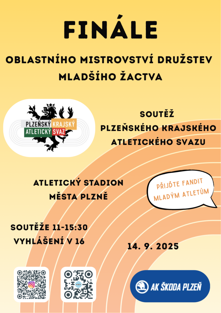 V neděli 14. 9. se na Atletickém stadionu města Plzně uskuteční Finále oblastního mistrovství družstev mladšího žactva. Tento závod bývá vrcholem sezóny této kategorie a je oblíbený jak u samotných závodníků a závodnic, tak u trenérů a rodičů.